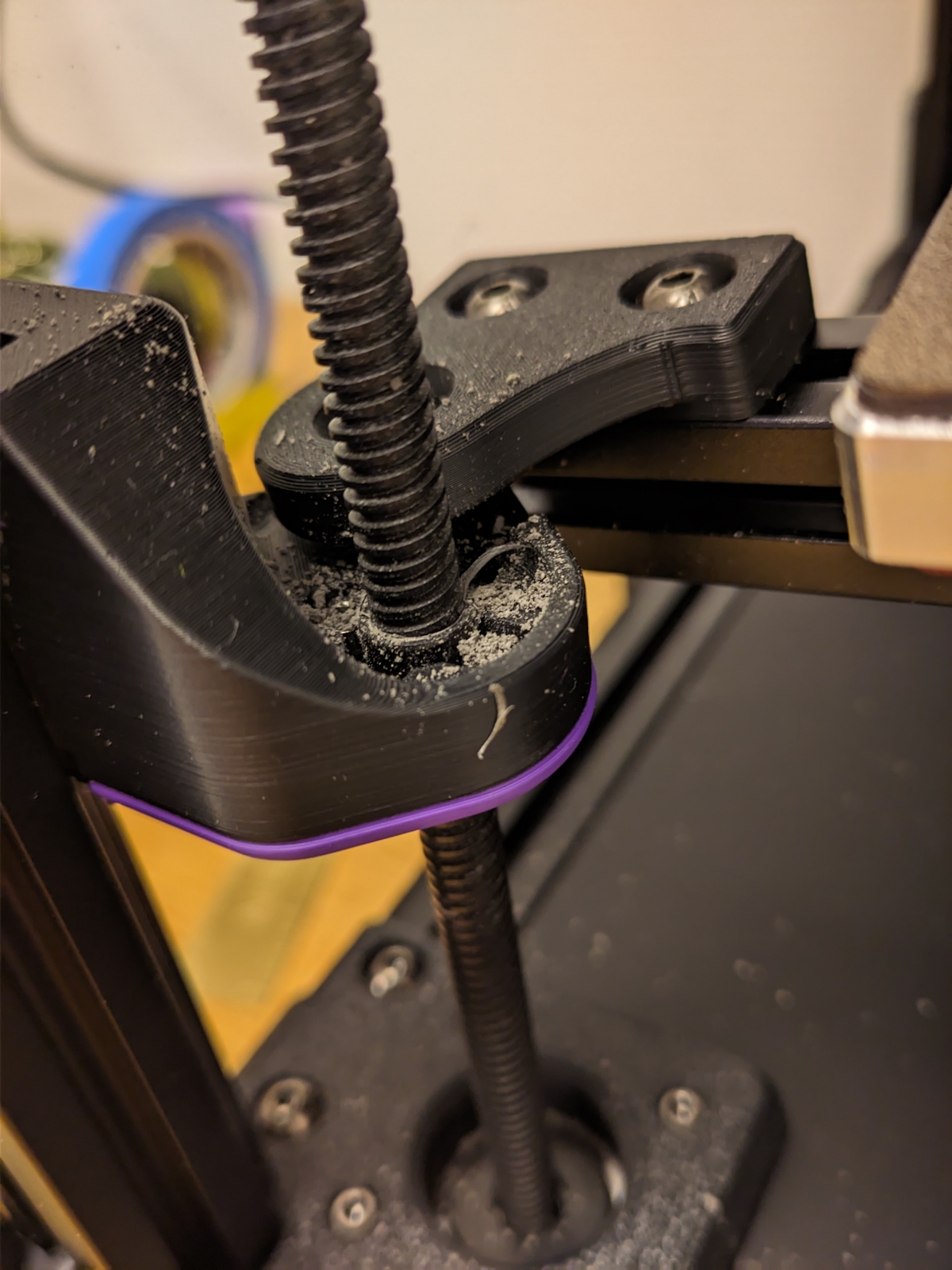 I found is a gap between the motor mount and the front extrusion. This should mean that the rod would be tilting backwards at a slight angle, which might mean that the rod would catch against the nut more in that direction, increasing the attrition on the nut.