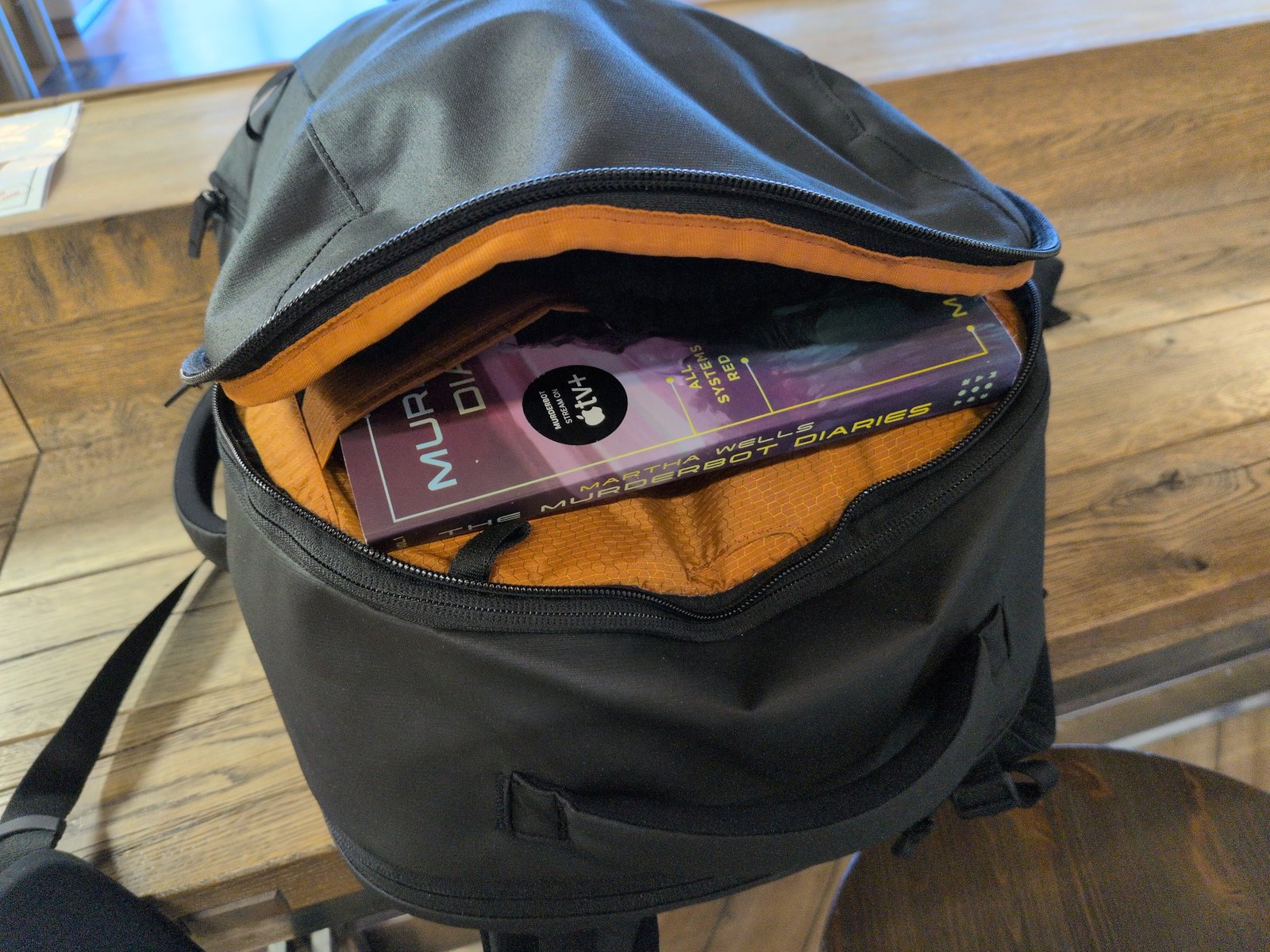 Last time I brought back five new fantasy and sci-fi books. This time I bought a small book that I could fit at the back above the laptop.