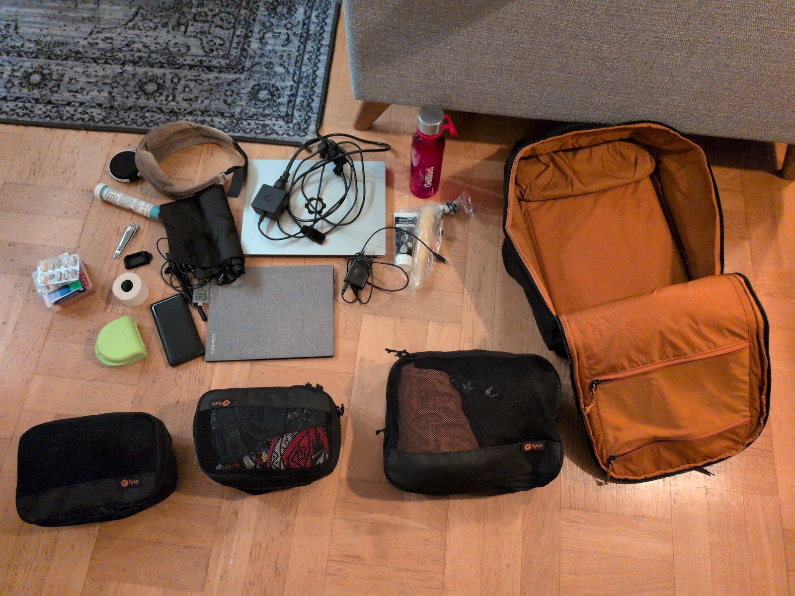 Before I could try out one bag travel I had to get a new backpack. I ended up with the Fyro Levo 30L backpack mostly because the creator had a bunch of cool videos about bags… As shipping was expensive I also got their packing cubes, the retractable key leash, and a 1L sling (that I didn’t use).