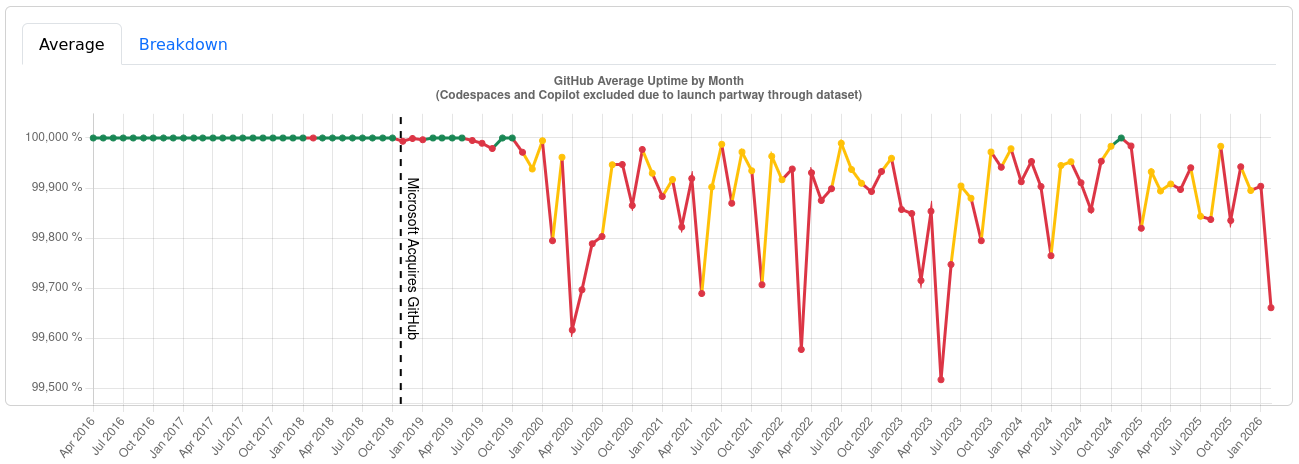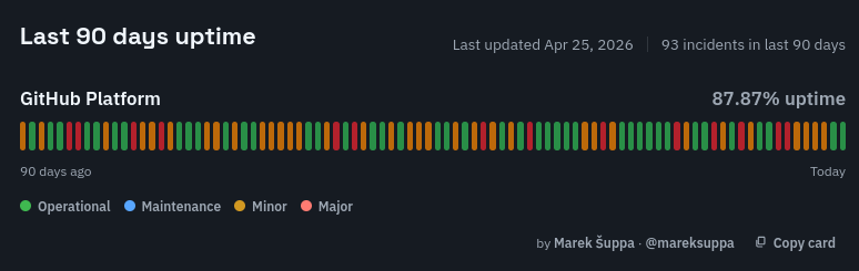 There’s empirical data to back up GitHub’s unreliability; just check out these uptime logs (taken 2026-04-27 from third party sites since the official status page predictably lies):